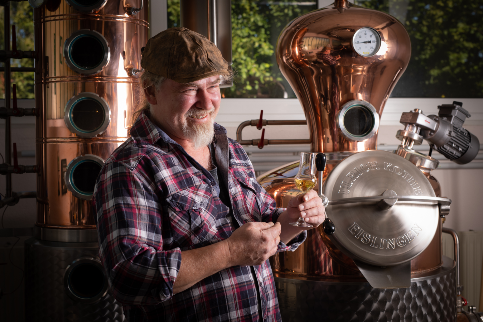 Der Alkohol muss nun im zweiten Schritt vom Wasser getrennt werden. Dazu wird die Mischung aus Alkohol und Gewürzen erhitzt. Alkohol hat einen deutlich niedrigeren Siedepunkt als Wasser und verdampft daher bei niedrigeren Temperaturen. So steigt der Alkoholdampf auf, der oben in der Brennblase in eine gekühlte Spirale geleitet wird. Dort wird er wieder flüssig. Das Ergebnis ist ein aromatisiertes Destillat mit etwa 96% Alkoholgehalt.