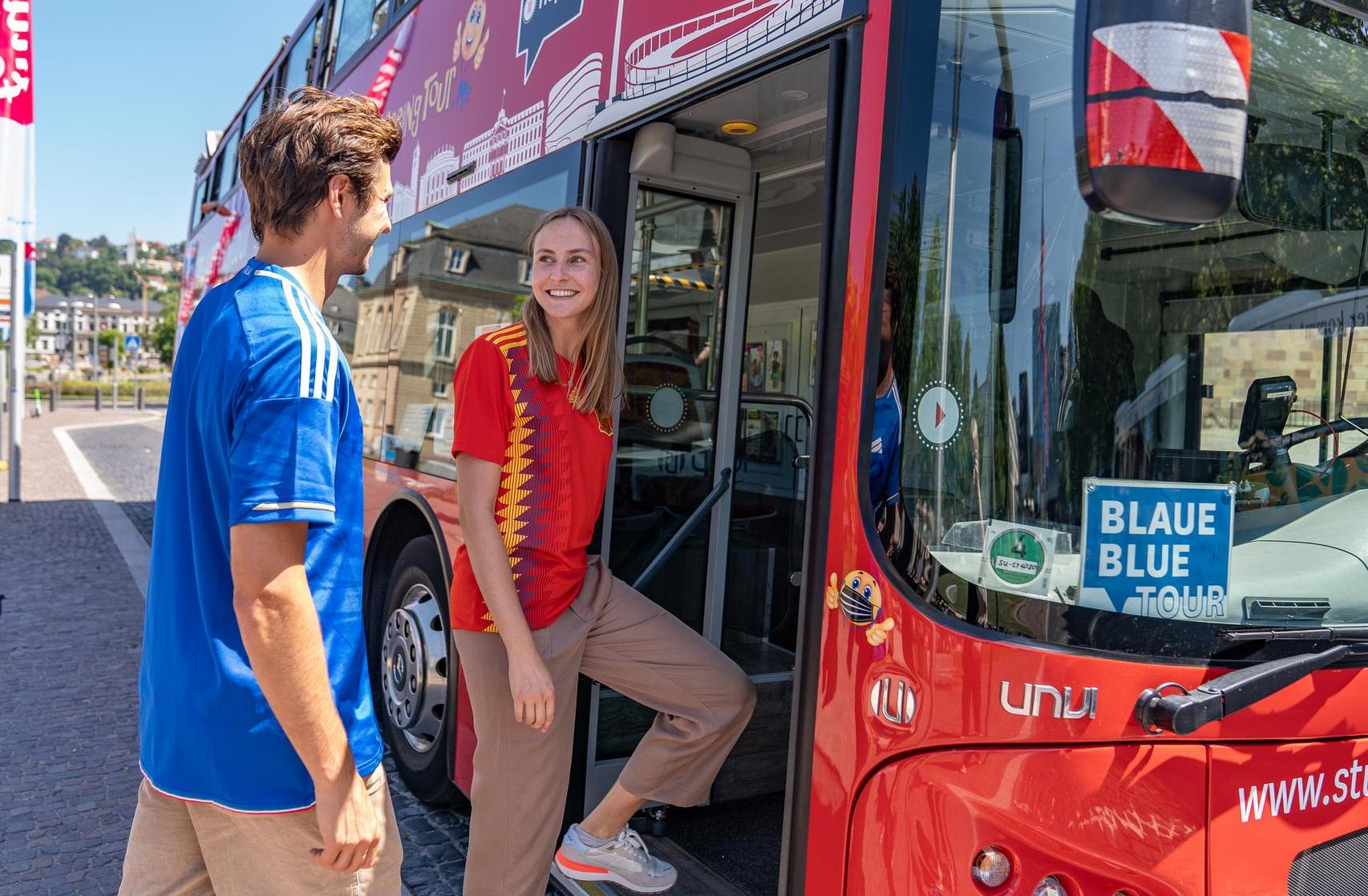 Wenn ihr schon mal da seid, wollt ihr gern etwas von der Stadt sehen? Aber viel rumlaufen ist nicht euer Ding? Dann ist die Citytour genau das richtige für euch! Ihr setzt euch bequem in den Cabrio-Doppeldeckerbus und lasst euch durch die Stadt fahren. Der Audioguide erzählt euch dabei witzige und interessante Geschichten aus Stuttgart. An jeder Station könnt ihr aussteigen und in einen der nächsten Busse wieder einsteigen. So bleibt genug Zeit für eigene Erkundungen. Übrigens: Die Blaue Tour hält sogar in der Nähe der Arena Stuttgart!