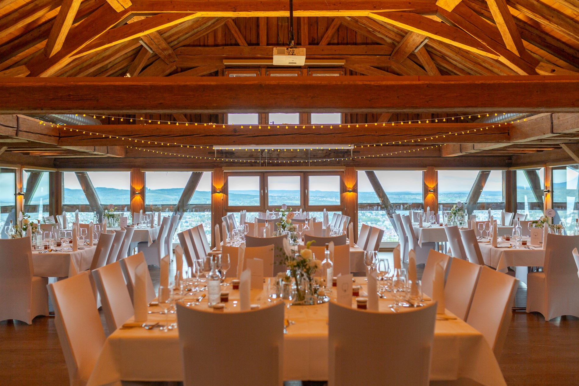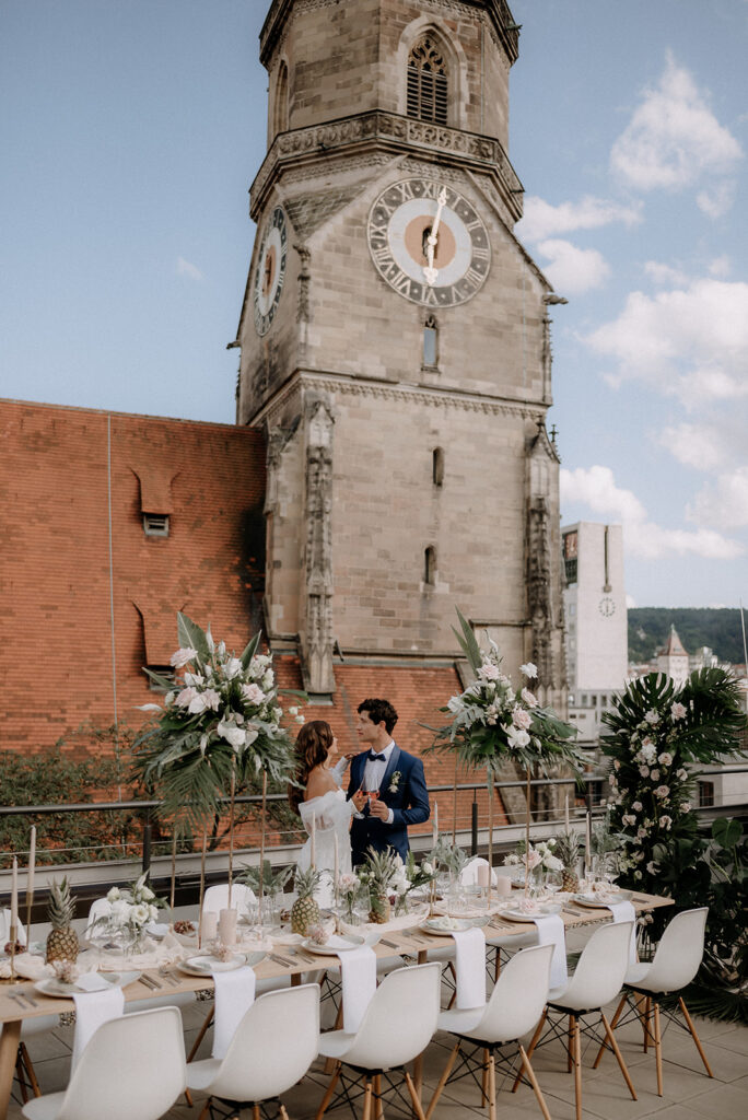 Etwas ganz Besonderes ist natürlich auch eine Hochzeitsfeier mit einem spektakulären Ausblick. Hoch über den Dächern der Stadt oder sogar noch höher auf einem Hügel der schwäbischen Alb. Wer ersteres bevorzugt ist bei „OutOfOffice“ genau richtig. Die Dachterrasse im 5. Stock direkt neben der Stiftskirche ist ein absolutes Highlight in der Altstadt Stuttgarts. Auch das Skyloft Stuttgart und das F&K Studio bieten eine aussichtsreiche Location in der Stadtmitte. Sollte euch das nicht hoch genug sein, bietet sich auch der Fernsehturm Stuttgart als Hochzeitsort an. Eine Trauung und Feier bei über 100 Metern kann wortwörtlich wenig übertreffen. Wenn ihr allerdings eher die Aussicht auf die Hügel und Berge der schwäbischen Alb bevorzugt, dann wäre eine Hochzeit in der Burg Hohenneuffen perfekt für euch!