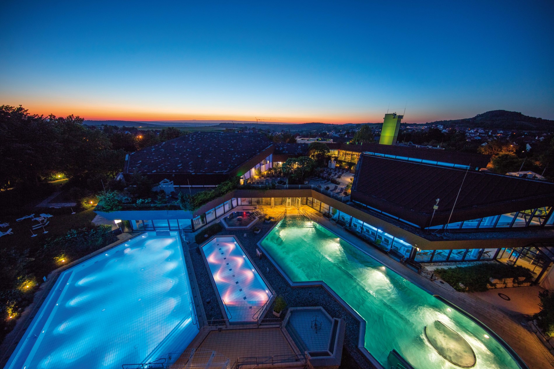 Das Wasser der Albthermen Bad Urach stammt aus 770 Metern Tiefe und wird direkt in die verschiedenen Becken gepumpt. Es hat eine Temperatur von 32 bis 38 Grad und ist perfekt geeignet, um es sich mal richtig gut gehen zu lassen und sich zu entspannen. Dazu kommt noch der tolle Blick auf die Schwäbische Alb mit der Burgruine Hohenurach und die Atmosphäre mit dem umgebenden Grün. Aber das Highlight ist die elegante Dekoration mit dem großen Kronleuchter und die abendlichen Lichtspiele – dadurch bietet die Albtherme abends ein ganz anderes Flair als tagsüber.