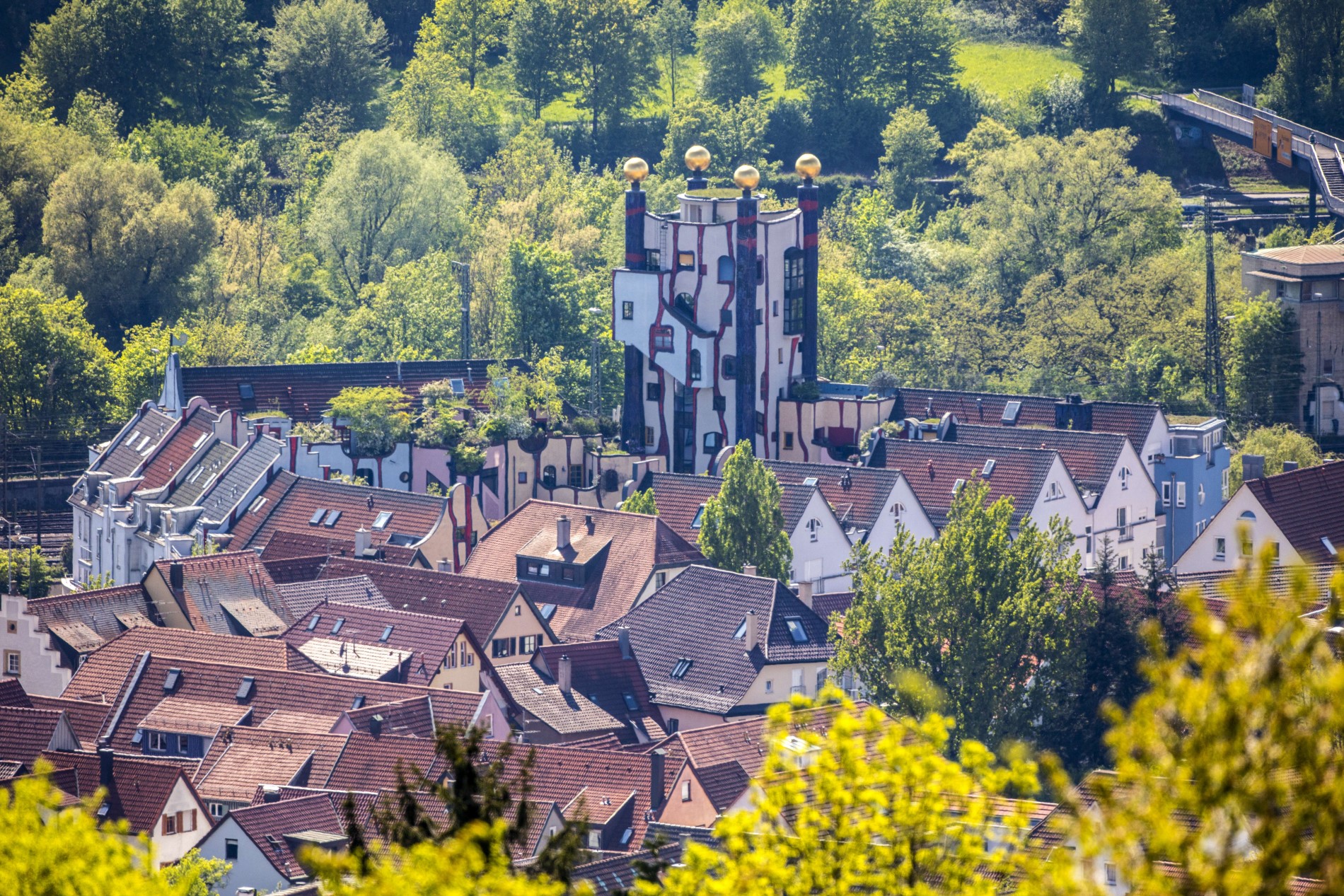 © Kulturamt Plochingen, Fotograf: Jean-Claude WinklerÜber den Stückelbergweg geht es über Treppen bergab und in der Weiherstraße stoßen wir wieder auf unsere Entdeckertour. Auf dem Weg in die Innenstadt erblicken wir noch einen verwunschenen Turm mitten im Wohngebiet, der daran erinnert, dass wir hier vor gut hundert Jahren noch mitten in den Weinbergen gestanden hätten. Ein weiterer Turm mit vier goldenen Kugeln interessiert die Kinder noch viel mehr – der Regenturm von Friedensreich Hundertwasser. Rechts und links des Turmes umgeben bunte Häuserfassaden mit tanzenden Fenstern den Innenhof der Anlage „Wohnen unterm Regenturm“. „Hier möchten wir auch wohnen“, sind sich die Kinder einig und kommen aus dem Staunen nicht heraus.