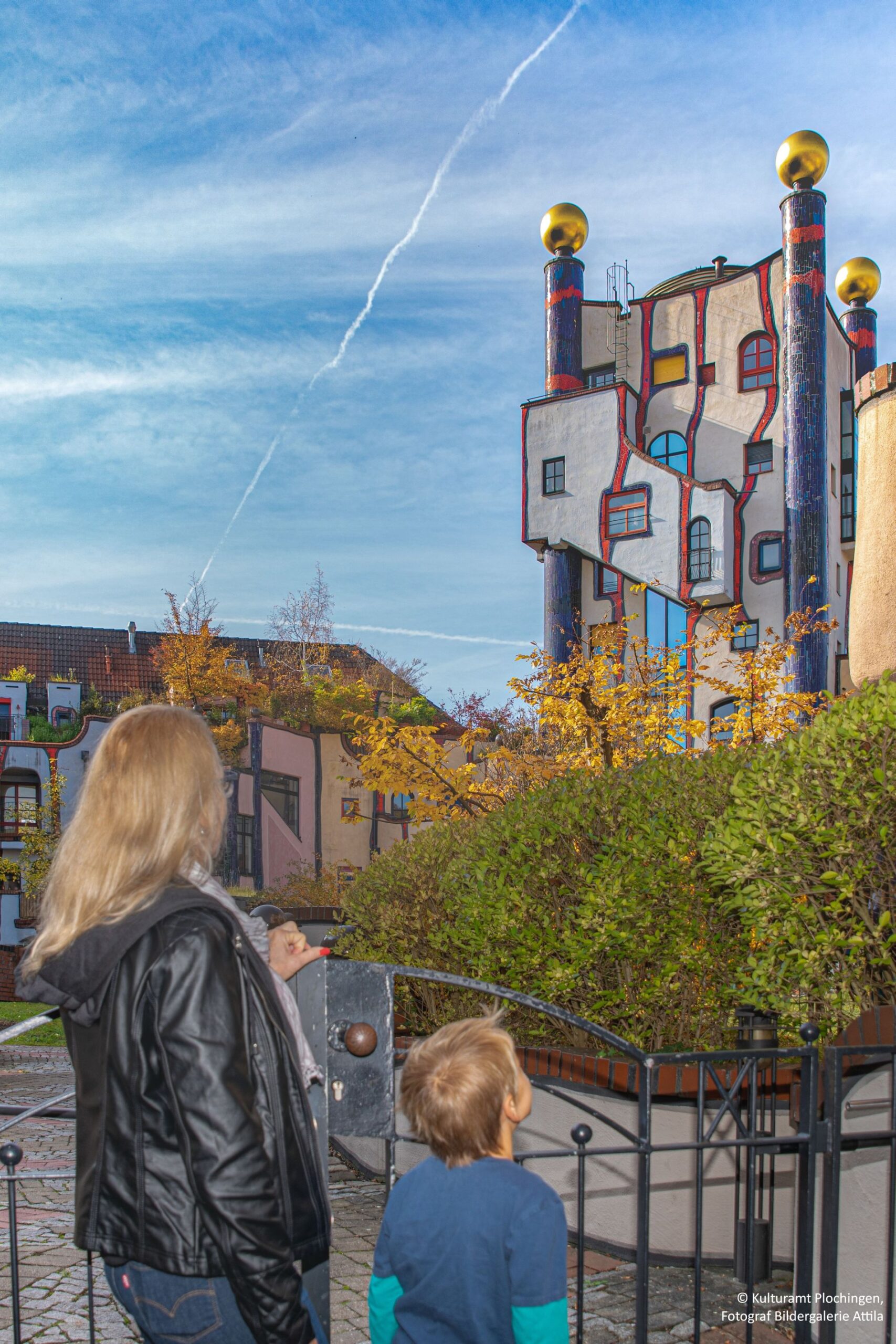 © Kulturamt Plochingen, Fotograf: Jean-Claude WinklerÜber den Stückelbergweg geht es über Treppen bergab und in der Weiherstraße stoßen wir wieder auf unsere Entdeckertour. Auf dem Weg in die Innenstadt erblicken wir noch einen verwunschenen Turm mitten im Wohngebiet, der daran erinnert, dass wir hier vor gut hundert Jahren noch mitten in den Weinbergen gestanden hätten. Ein weiterer Turm mit vier goldenen Kugeln interessiert die Kinder noch viel mehr – der Regenturm von Friedensreich Hundertwasser. Rechts und links des Turmes umgeben bunte Häuserfassaden mit tanzenden Fenstern den Innenhof der Anlage „Wohnen unterm Regenturm“. „Hier möchten wir auch wohnen“, sind sich die Kinder einig und kommen aus dem Staunen nicht heraus.
