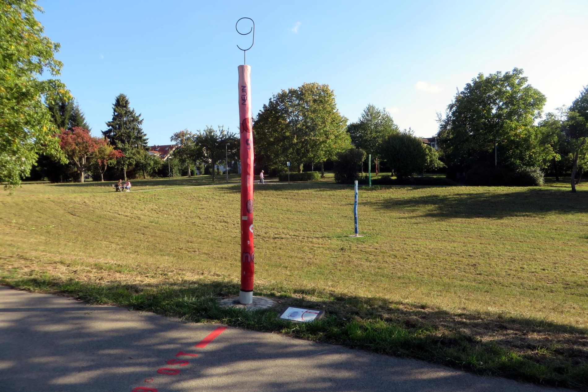 Schon kurze Zeit später wird der Weg im Grünzug Diezenhalde zu einer richtigen „Grad-Wanderung“, wir überqueren nämlich den 9. Längengrad Ost! Dieser durchzieht außer Böblingen auch beispielsweise Städte wie Bremen und Genua. Mehrere Baumstämme, die in einem Projekt der städtischen Kunstschule gestaltet wurden, markieren den Meridian und beschäftigen sich mit dem Thema. Entlanglaufen und anschauen unbedingt erwünscht!