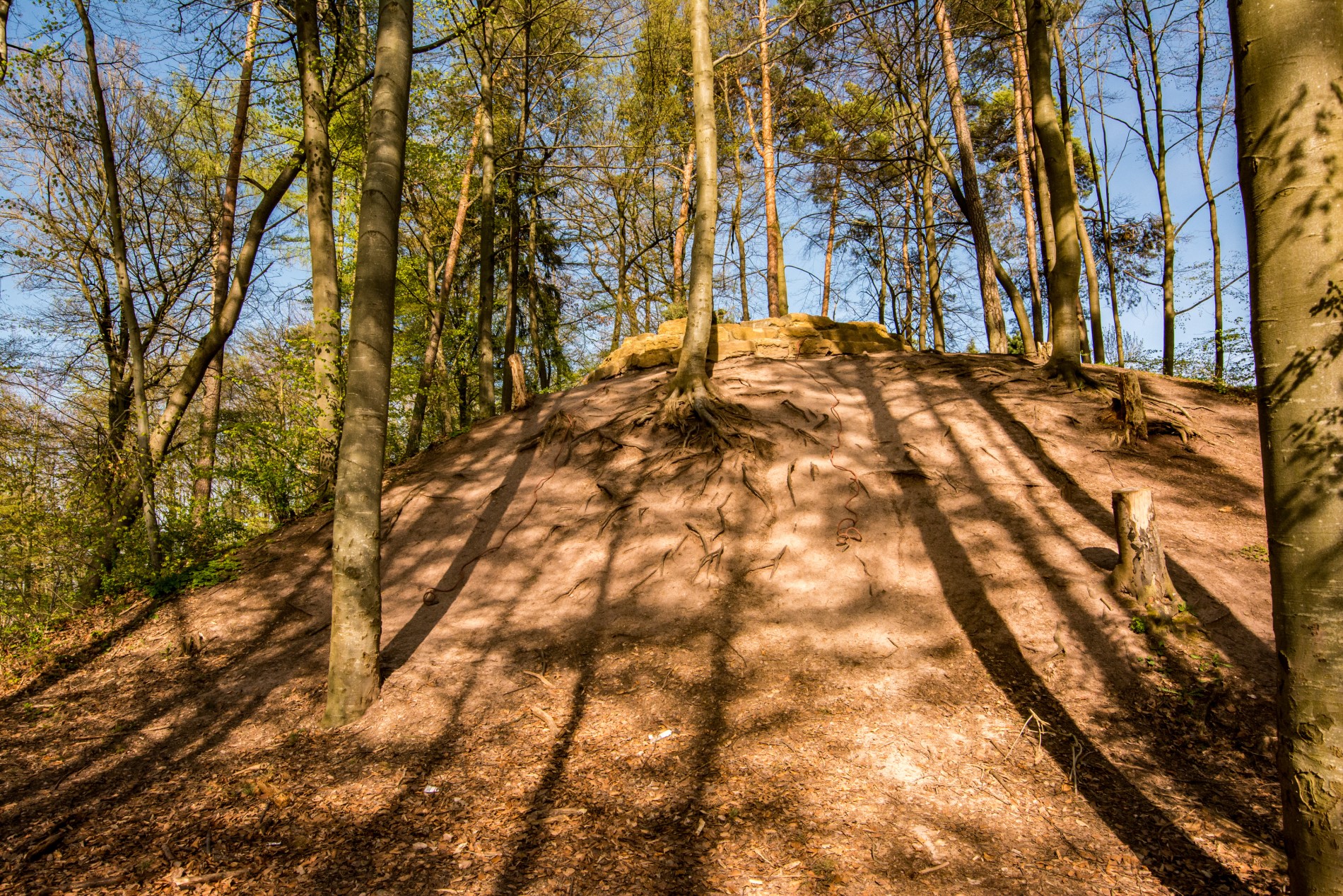 Am Waldfriedhof biegen wir ab und statten dem rekonstruierten frühkeltischen Grabhügel am Rand des heutigen Friedhofs einen Besuch ab. Es handelt sich um einen von ursprünglich weit über 20 Grabhügeln, die sich vor rund 2.500 Jahren hier befunden haben. Schon bereits seit der Jungsteinzeit wurde das Gelände genutzt – anfänglich als Siedlungs-, und ab der Bronzezeit als Bestattungsplatz.