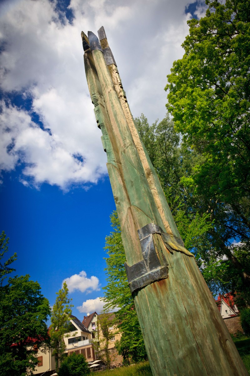 © WTM GmbH Waiblingen, Fotograf: Kai Koepf | Brunnen von H. R. DeckerDie Baumskulptur von Michael Turzer ragt als gigantische grüne Stele in den Himmel. Sie verweist auf die ursprüngliche Ulme, gibt Zeugnis vom Wandel des Ortes und ist zugleich ein eigenständiges Kunstwerk.
