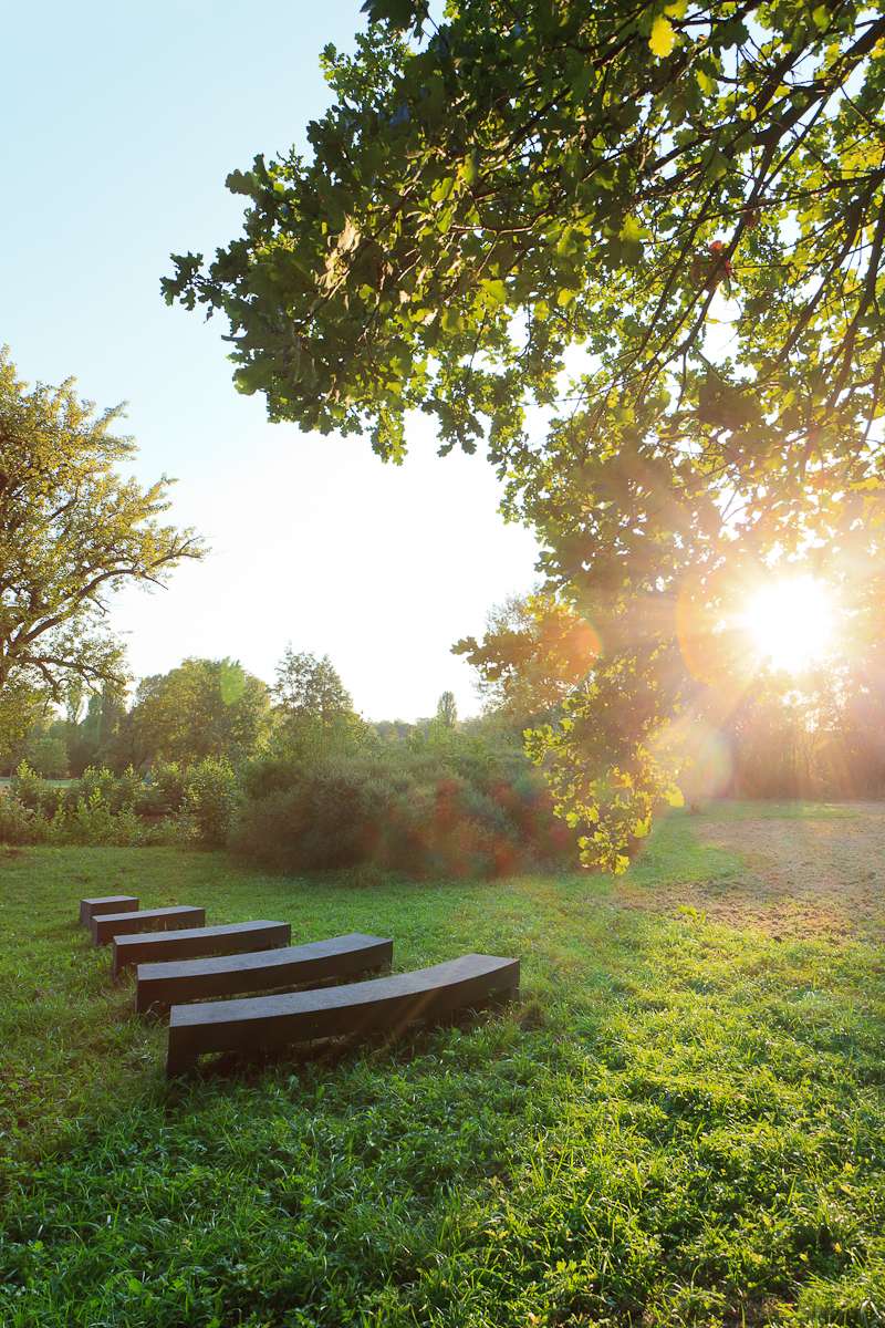 © WTM GmbH Waiblingen, Fotograf: Kai Koepf | Stahltisch von Erdschollen bedeckt von Peter HaussmannBis zum Talauesee geht es ohne „Kunststopp“ weiter, wo „Our seats are almost touching“ Sitzgelegenheiten und gleichzeitig Kunstwerk sind. Paul Bradley, britischer Künstler, schuf fünf verschieden große, hintereinander gestaffelte Kreisabschnitte aus Beton, die am Ufer des Talauesees zum Verweilen einladen. Bradleys Ziel war es, einen Ort der Begegnung wie auch des Naturerlebens zu schaffen.