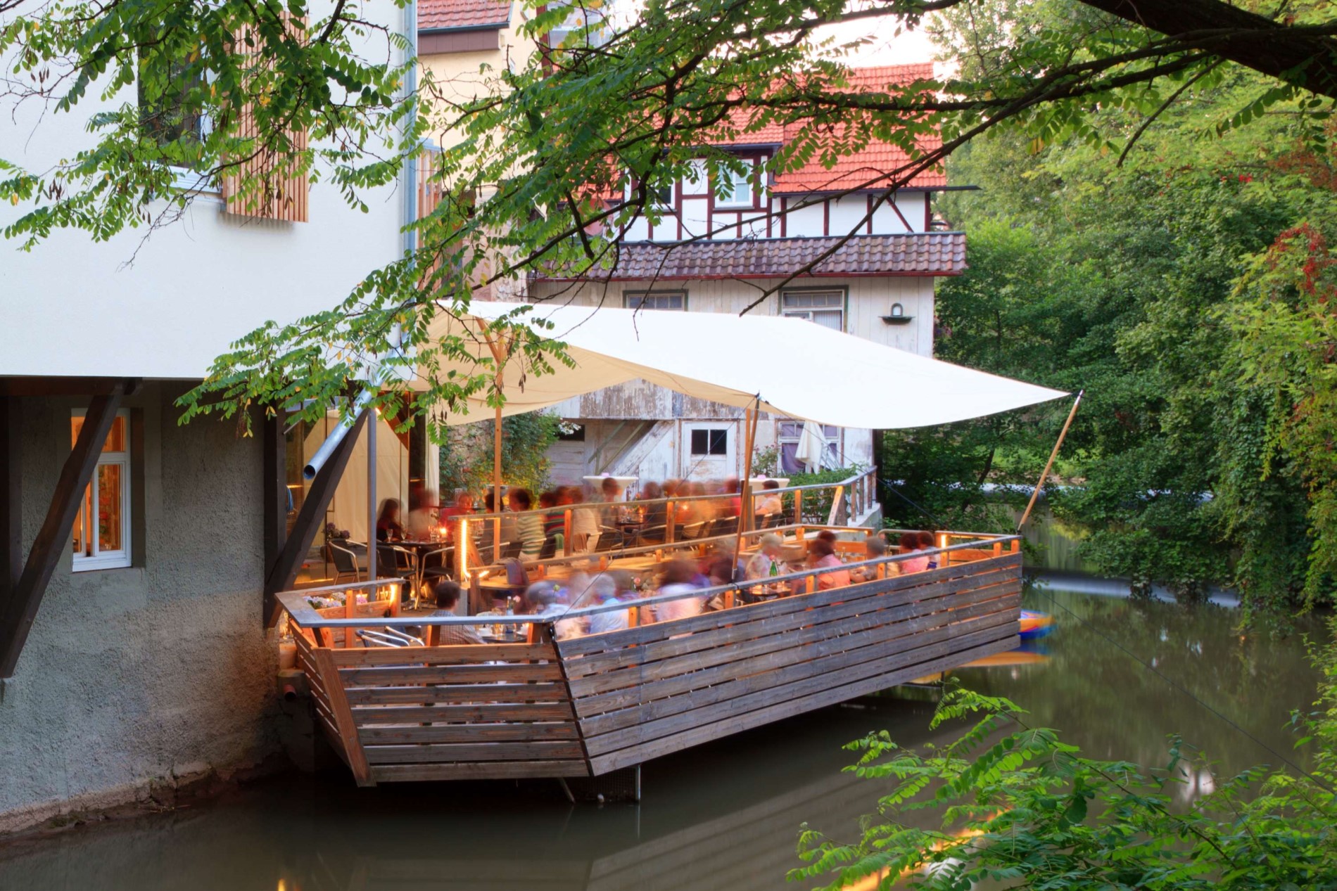 © SMG, Achim Mende | Pavillon für Waiblingen von Olafur EliassonEin paar Schritte Richtung Fluss ist „Mann auf Seepferdchen“ von Stephan Balkenhol im Wasser erkennbar. Stephan Balkenhol ist bekannt dafür, dass der Protagonist ein in Hose und Hemd gekleideter Mann ist, der mit unbestimmten Gesichtsausdruck seine Umwelt betrachtet. Die Skulptur wurde technisch aufwändig an Ihren Platz mitten in der Rems verankert und bereichert den Galerieplatz seit 2018.
