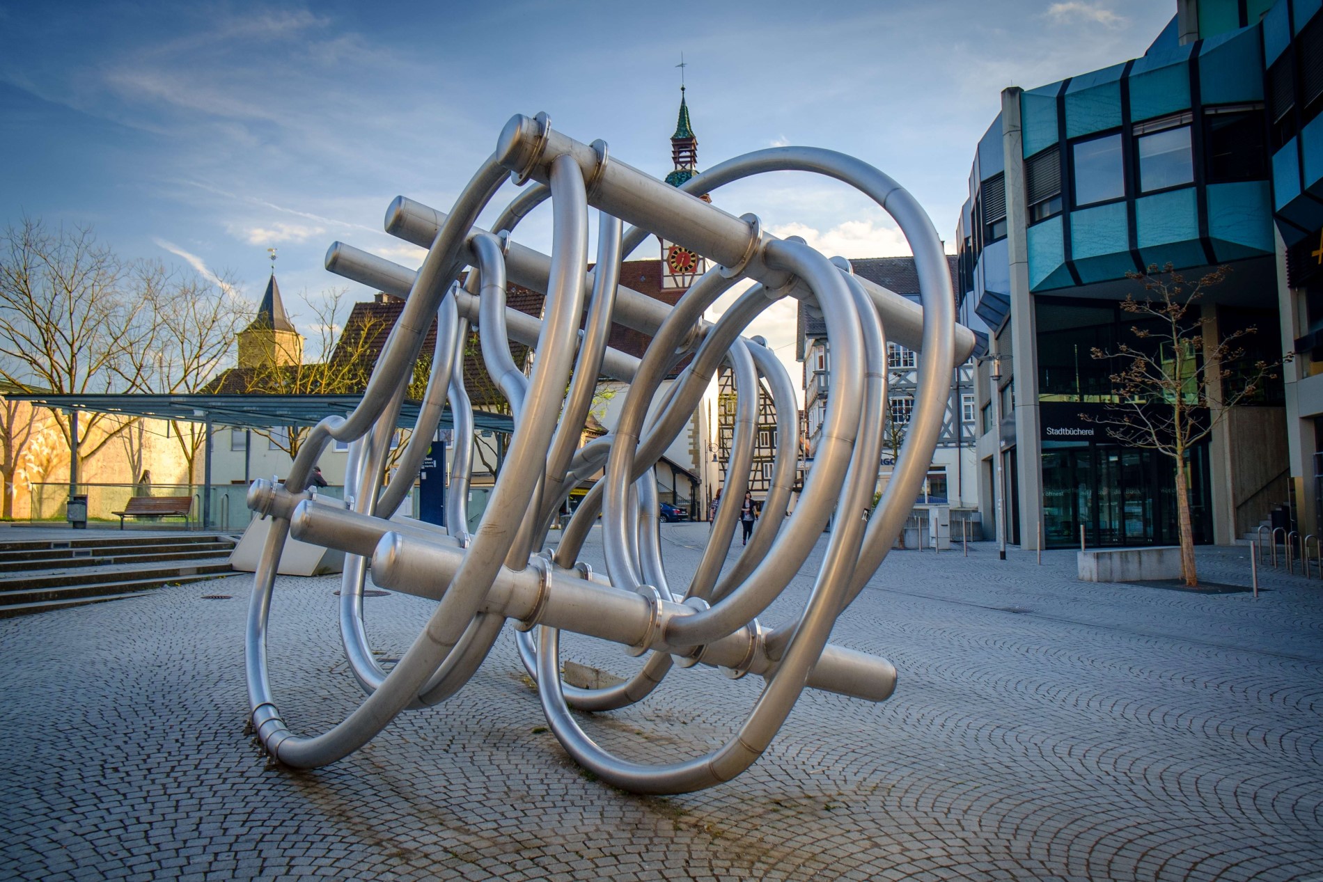 © WTM GmbH Waiblingen, Fotograf: Kai Koepf | This is not a story von Richard DeaconÜber den Marktplatz zurück an der Galerie Stihl Waiblingen schließt sich der künstlerische Spaziergang durch Waiblingen. Jetzt warten Cafés und Restaurants darauf, erkundet und ausprobiert zu werden.