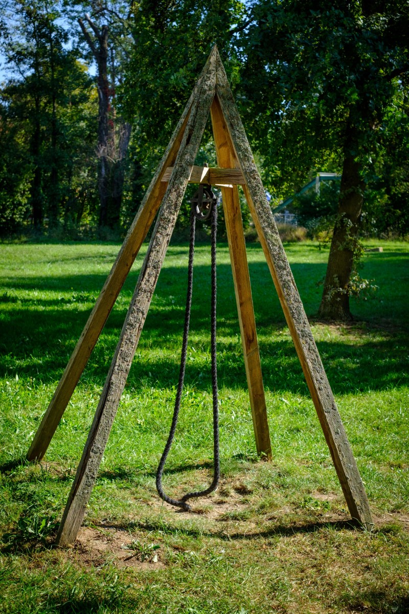 © WTM GmbH Waiblingen, Fotograf: Kai Koepf | Neun bis fünf von Tobias Rehberger„Brunnen“: Auf den ersten Blick mutet die Installation H. R. Decker wie eine gewöhnliche Brunnenkonstruktion an – auf einem Gerüst aus Holzstreben ist eine Winde montiert, über die ein Seil läuft. Doch fehlt der Schöpfbehälter am Ende des Seils ebenso wie der eigentliche Brunnenschacht.