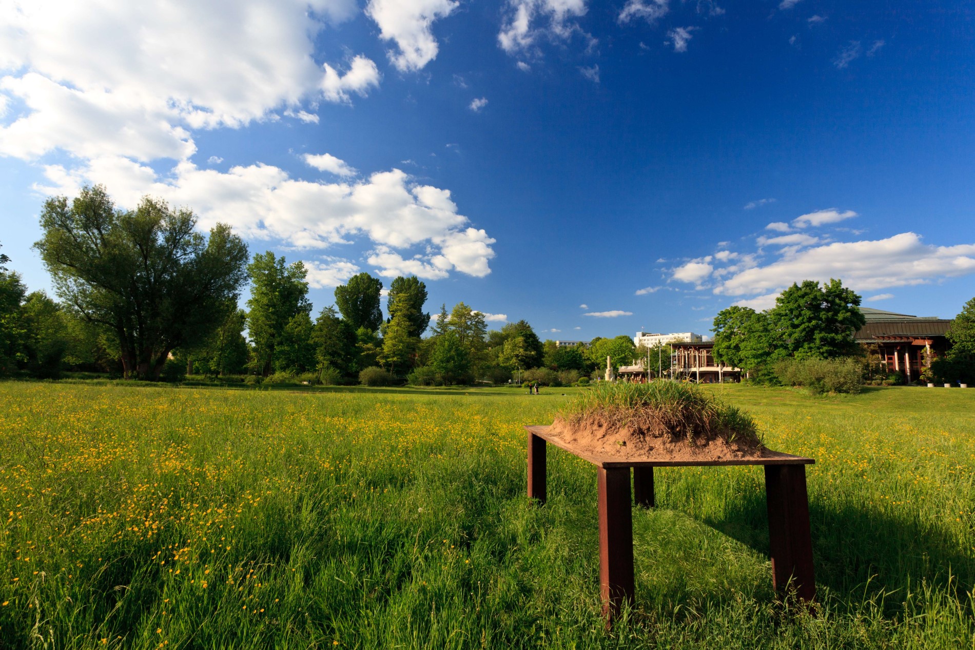 © WTM GmbH Waiblingen, Fotograf: Kai Koepf | Baumskulptur von Michael TurzerAuf der gegenüberliegenden Remsseite steht auf der Brühlwiese „Stahltisch, mit Erdschollen bedeckt von Peter Haussmann: Ein überdimensionaler Tisch trägt einen Erdhaufen, auf dem wild Pflanzen wuchern.