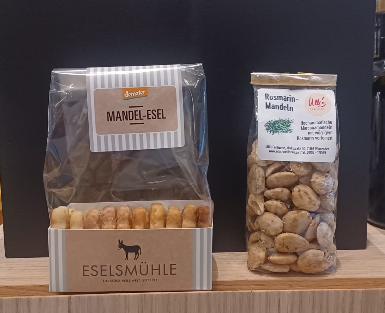 Ulli’s Confiserie steht für erlesene Schokoladenkreationen und wurde dafür mit dem „Süßen Stern 2024“ ausgezeichnet. Seit 2022 verarbeitet die Manufaktur ausschließlich Kakao von Original Beans, einem der nachhaltigsten Schokoladenhersteller weltweit. Doch nicht nur Schokolade beherrschen sie meisterhaft – auch ihre feinen Nuss-Spezialitäten sind ein echter Genuss. Preis Stand 18.09.25: Rosmarin-Mandeln 7€