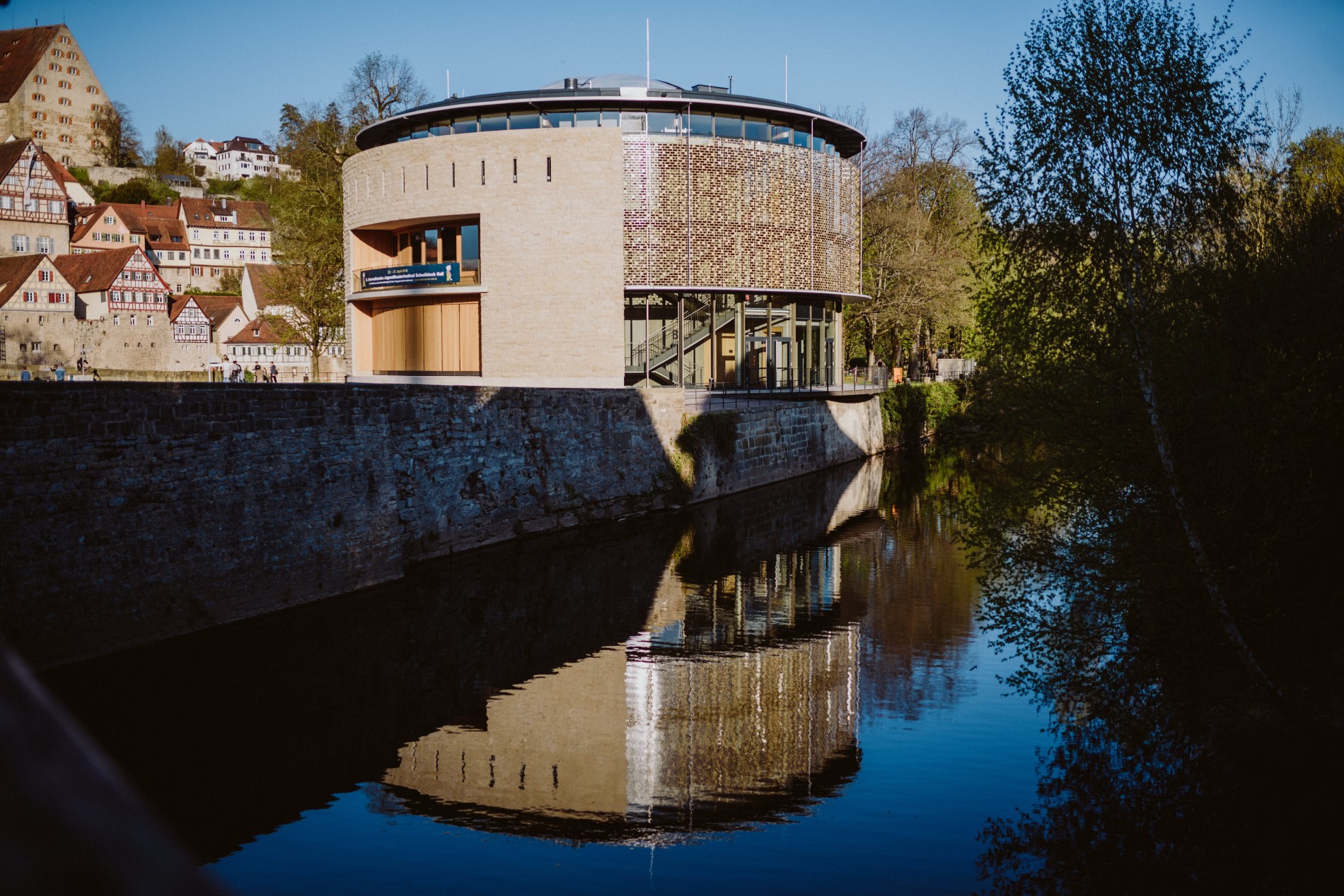 © Nico KurthZurück aus den Ackeranlagen trifft man am Unterwöhrd auf das Neue Globe Theater, ein Nachbau des Shakespeare Globe Theaters in London, in denen nahezu täglich Theateraufführungen und weitere Veranstaltungen stattfinden. Über die Holzbrücke „Roter Steg“ gelangt man dann in die Katharinenvorstadt und von dort über kleine Wege und alte Steintreppen in die Kunsthalle Würth, die bei freiem Eintritt internationale moderne und zeitgenössische Kunst ausstellt, darunter Werke von Beuys, Baselitz, Hundertwasser oder Picasso. In der Johanniterkirche, unweit der Kunsthalle Würth, können außerdem die „Alten Meister“ der Sammlung betrachtet werden.