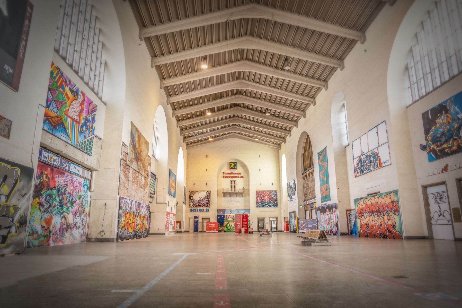 © SMGDas Kunstmuseum Stuttgart hat zusammen mit dem StadtPalais am 26. September 2020 eine Ausstellung zu Wänden eröffnet. Im Kunstmuseum wurde die Wand als Grenze und als Schutz des Individuums thematisiert, während die Ausstellung „Graffiti im Kessel“ im StadtPalais StreetArt in Stuttgart präsentiert hat. Hier wurden die Grundlagen der Kunstform erklärt und die geschichtliche Entwicklung veranschaulicht. Auf circa 2.000 Fotos sind verschiedene Hall of Fame’s, beliebte Graffiti-Spots und Werke entlang der Bahnlinien zu sehen. Als zusätzliches Highlight wurde die „Secret Walls Gallery“ im Hauptgebäude des Stuttgarter Hauptbahnhofs, dem Bonatzbau, umgesetzt. Da wegen Restaurierungsarbeiten und der Stuttgart21-Baustelle die Läden, Bistros und Buchhandlungen aus dem Gebäude ausziehen mussten, fehlte es dem Bonatzbau an Lebendigkeit. Im Rahmen der Ausstellung wurden über 70 Sprayer:innen beauftragt, dem historischen Bauwerk wieder Leben einzuhauchen. Viele verschiedene Kunstwerke in den unterschiedlichsten Stilrichtungen und Größen dekorierten die leere Halle. Die „Secret Walls Gallery“ war leider nur bis Ende Januar zu besichtigen, aber in unserem Video könnt ihr einige Aufnahmen des Projekts bewundern.