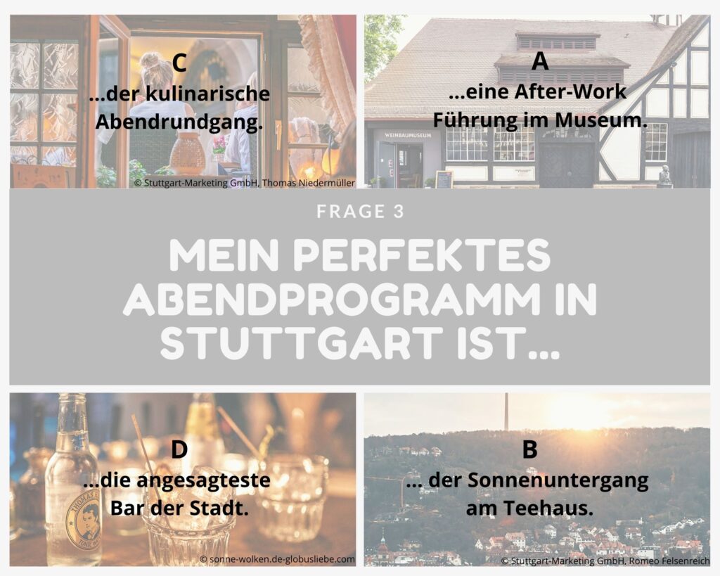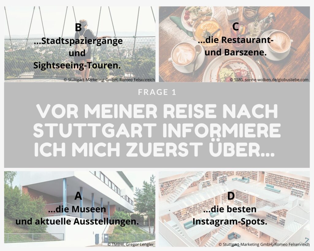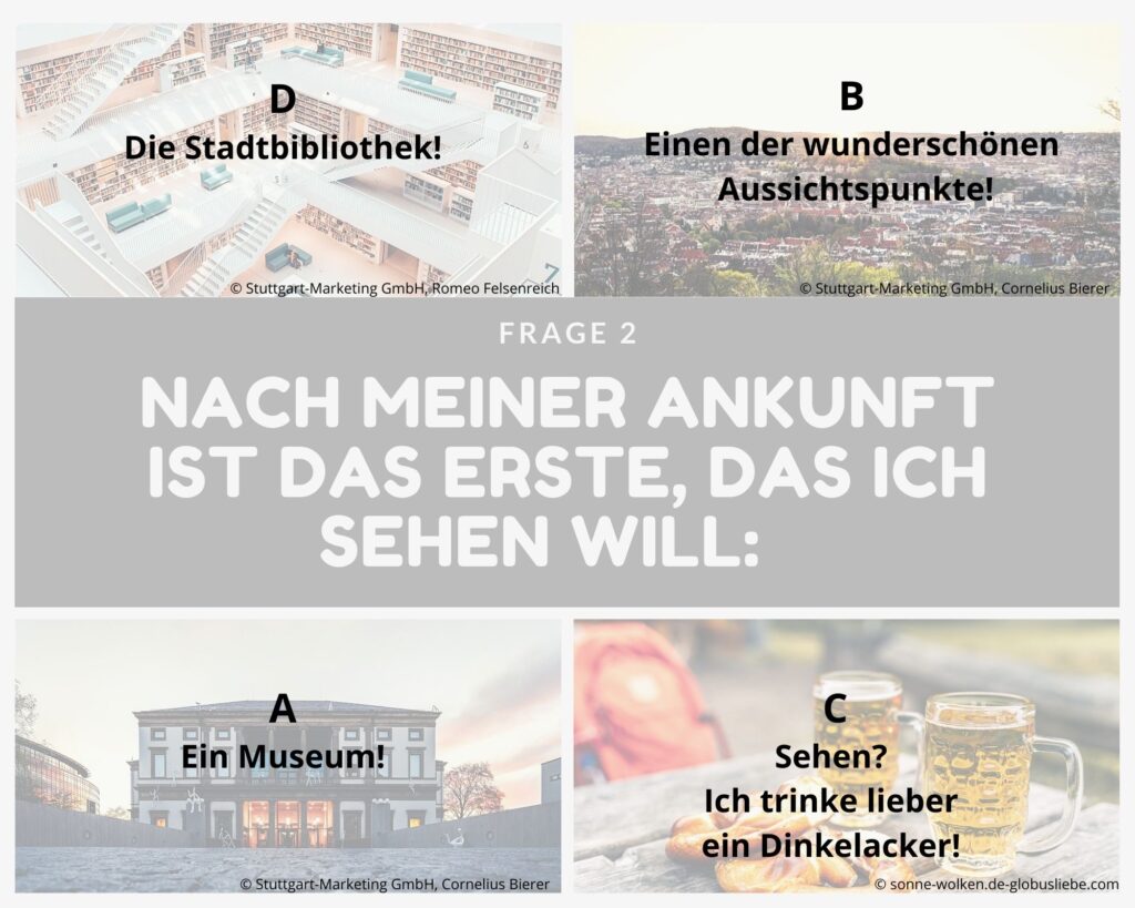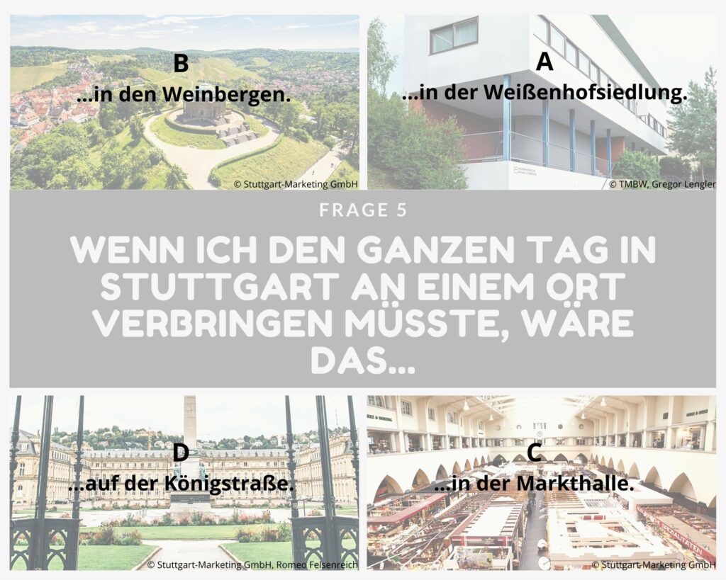 Kleine Entscheidungshilfe für die Planung deines Stuttgart-Aufenthaltes gefällig? Dann teste dich einmal quer durch unsere Fragen und finde heraus, welche Art Stuttgart-Typ du bist! Zähle einfach die Buchstaben deiner Antworten zusammen oder notiere sie dir nebenher und schaue am Ende, welcher Gruppe du angehörst und welche Sehenswürdigkeiten (unter anderem) zu dir passen!