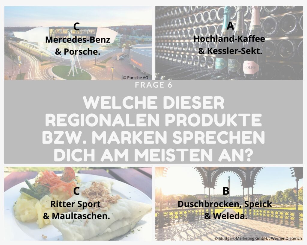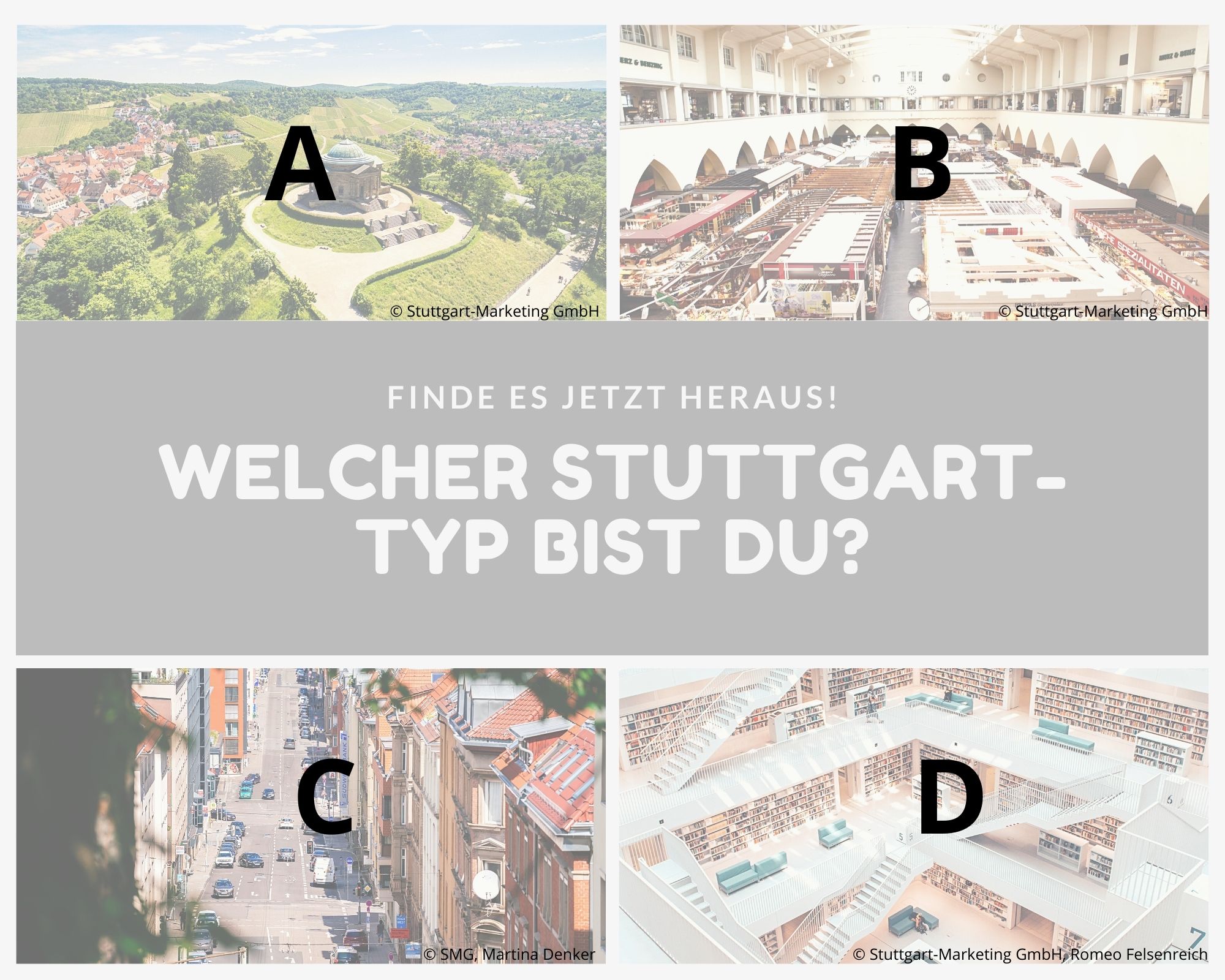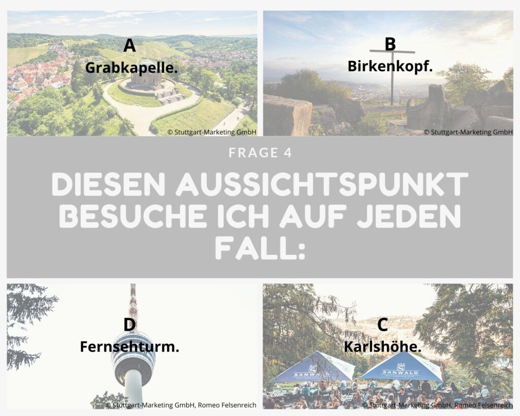 Kleine Entscheidungshilfe für die Planung deines Stuttgart-Aufenthaltes gefällig? Dann teste dich einmal quer durch unsere Fragen und finde heraus, welche Art Stuttgart-Typ du bist! Zähle einfach die Buchstaben deiner Antworten zusammen oder notiere sie dir nebenher und schaue am Ende, welcher Gruppe du angehörst und welche Sehenswürdigkeiten (unter anderem) zu dir passen!