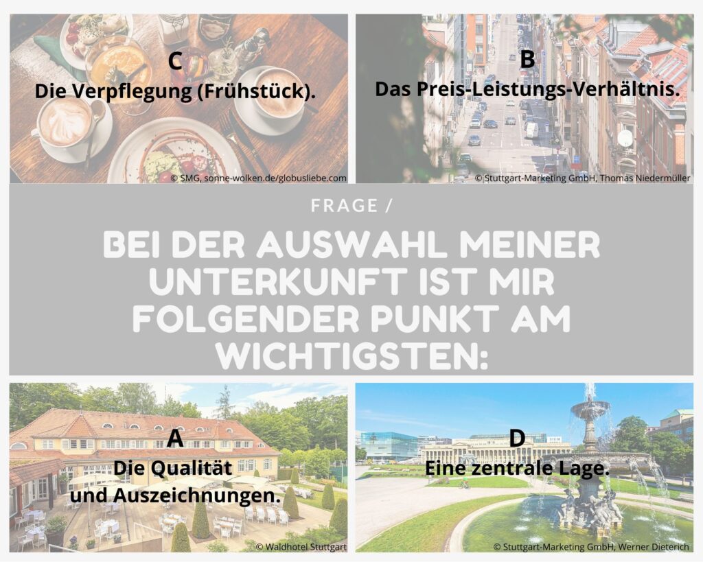 A am häufigsten: Kulturfan Du liebst deine Städtetrips kulturell und übernachtest am liebsten in einem qualitativ hochwertigen Hotel, welches bestenfalls noch mindestens 4 Sterne aufweisen kann. Deine Hauptattraktionen in Stuttgart sind ganz klar die Weißenhofsiedlung (UNESCO-Weltkulturerbe), die Staatsgalerie und auch die Staatstheater. Für abends empfehlen wir eine Weinprobe mit den besten Tropfen aus der Region.