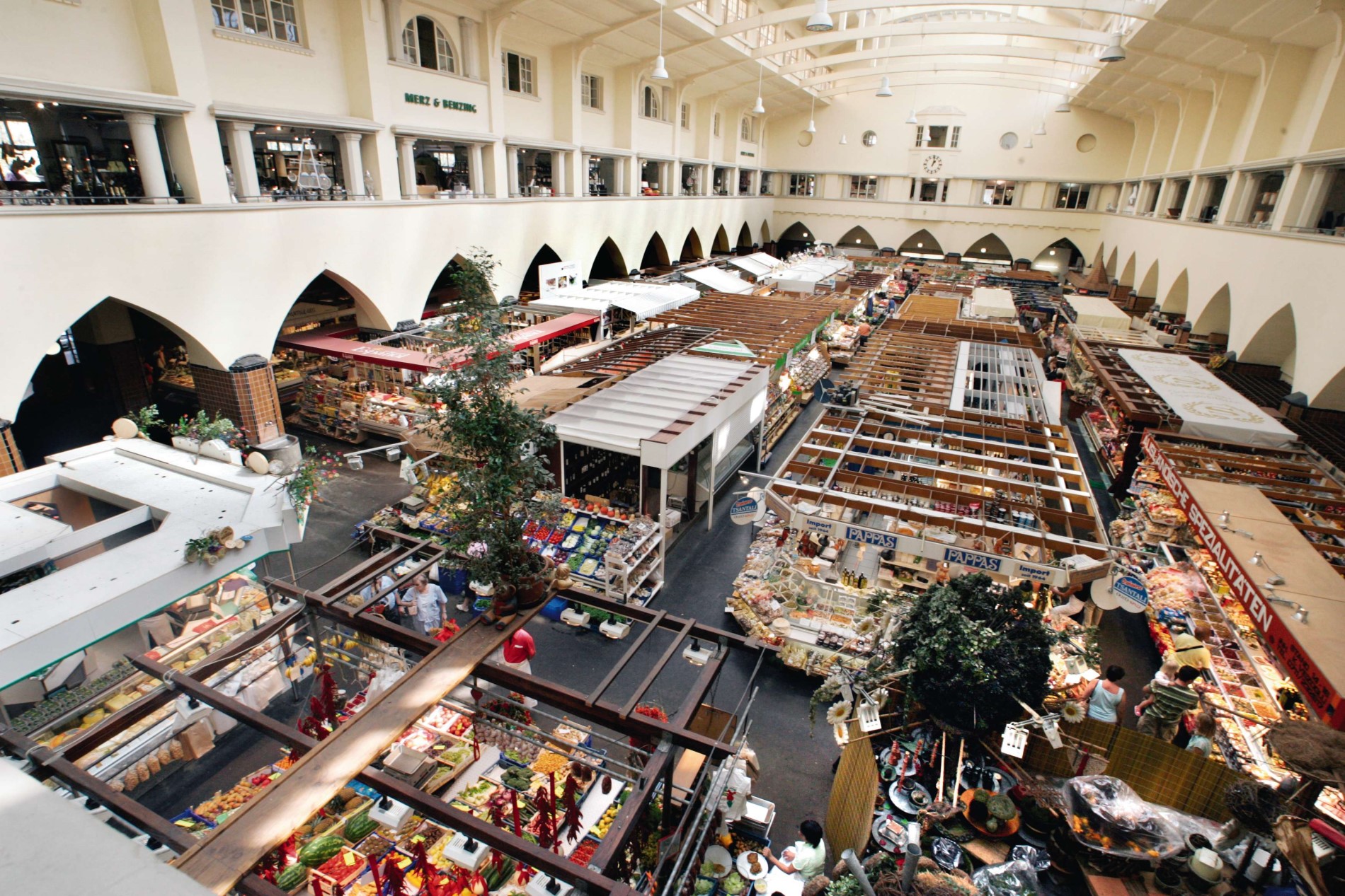 So, nun aber nichts wie los und eintauchen in den Genusshimmel: die Markthalle. Lasst euch einfach treiben und kauft Leckereien nach Lust und Laune. Zum gleich Snacken, oder aber in jedem Fall für später am Nachmittag! Schaut auch mal auf den Boden und außen an die Fassade. Alte Schienen und tolle Wandmalereien erzählen von der Geschichte der Markthalle. Warum aber auch nicht bei einem Glas Sekt in der Empore den Blick von oben auf die Stände genießen? 😉 (Alkoholfrei könnt ihr euch mit einem Schluck Wasser aus dem grünen Ceresbrunnen direkt darunter erfrischen. Das ist Trinkwasser!)