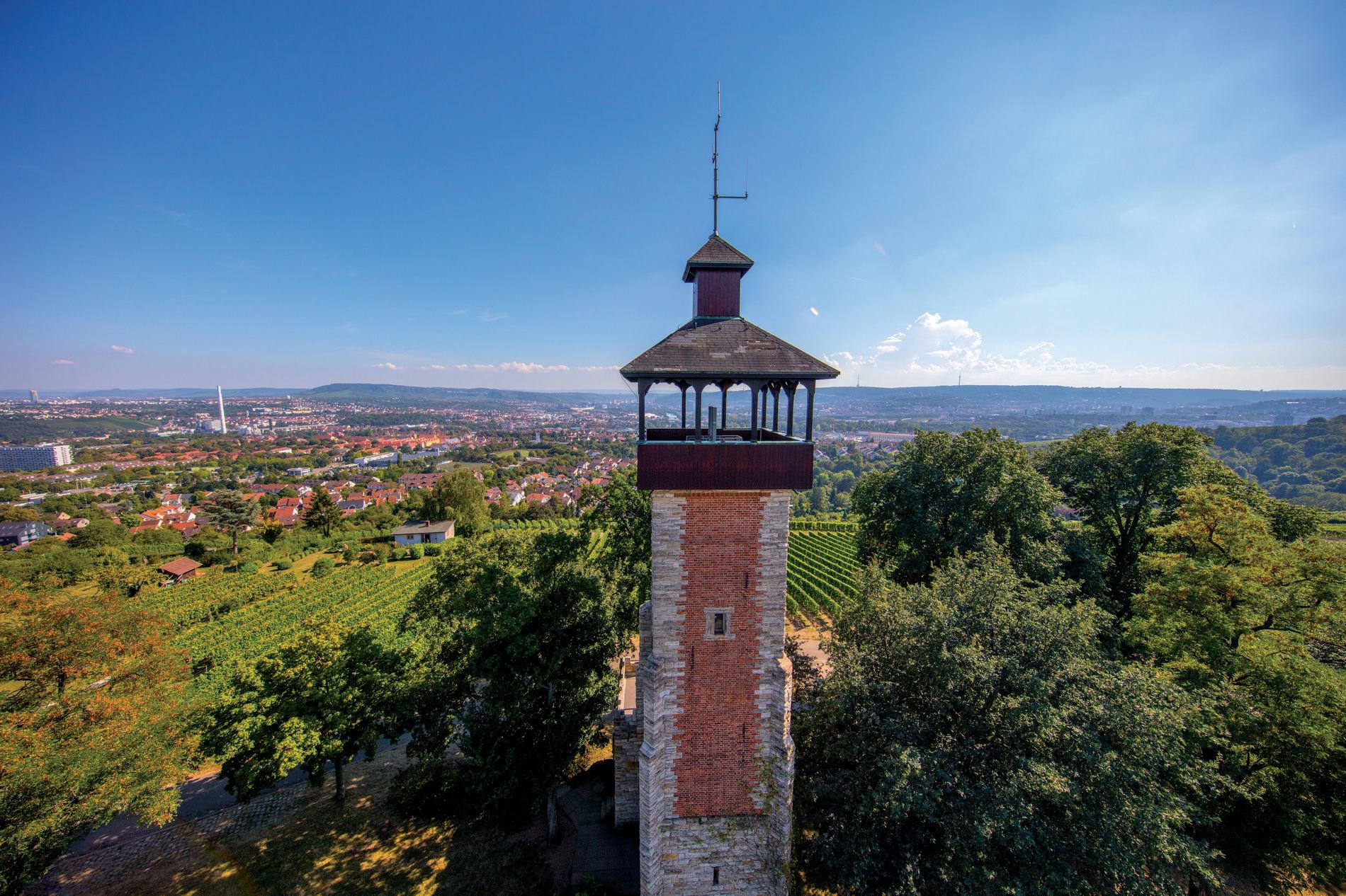 Eine der schönsten Aussichten über ganz Stuttgart: Wer die 92 Stufen zur Plattform des 20 m hohen Bismarckturmes erklimmt, wird mit einem fantastischen Rundum-Panorama belohnt! Von hier blickt ihr auf den Norden der Stadt und weiter hinten auf die Innenstadt. Auf der anderen Seite des Kessels winkt euch der SWR Fernsehturm zu. Zum Bismarckturm