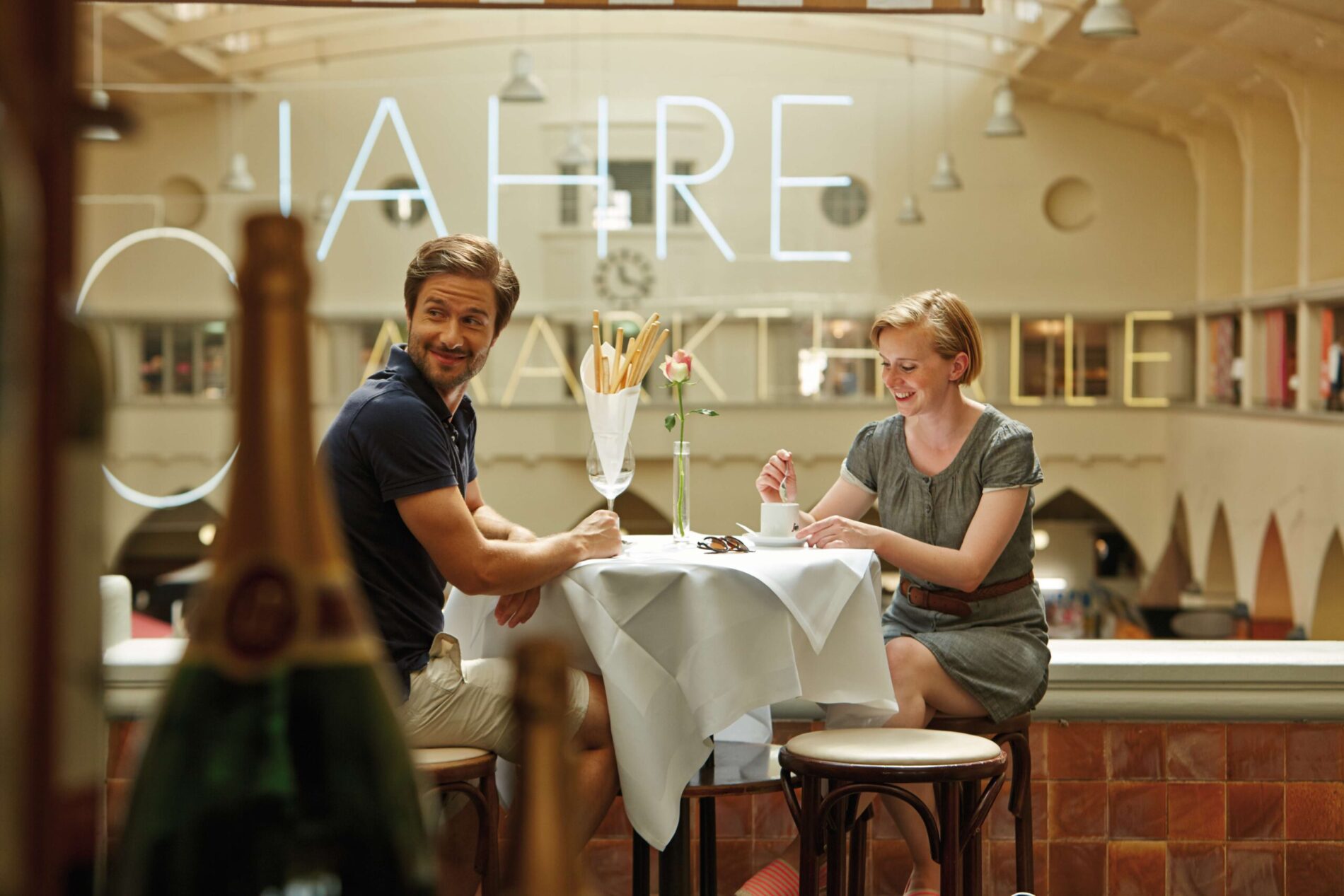 Ein Erlebnis für alle Sinne erwartet euch in der Stuttgarter Markthalle. Hier findet ihr alles, was ein romantisches Dinner braucht. Wer vor Ort in den Genuss kommen möchte, dem empfehlen wir ein Glas Sekt auf der Empore.