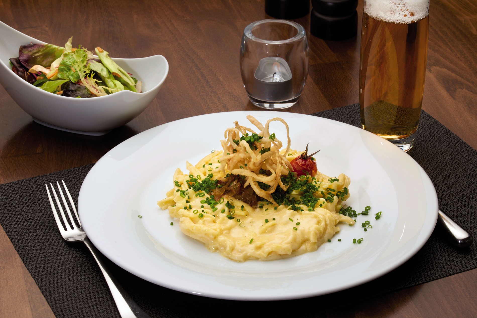 Herzhafte Hausmannskost vom Feinsten. Leckere Spätzle nach schwäbischem Rezept, kombiniert mit Käse und Röstzwiebeln – unbedingt probieren! Mit Spätzle wächst hier jedes Kind auf: Spätzle mit Soß‘, Käsespätzle, Spätzle mit Linsen (Rezept steht weiter unten). Aber auch die Großen essen es immer wieder gern – ein echtes Soulfood! [fusion_accordion type=““ inactive_icon=““ active_icon=““ margin_top=““ margin_bottom=““ hide_on_mobile=“small-visibility,medium-visibility,large-visibility“ class=““ id=““ boxed_mode=““ border_size=“0″ border_color=““ hue=““ saturation=““ lightness=““ alpha=““ hover_color=““ background_color=““ divider_line=““ divider_hover_color=““ divider_color=““ padding_top=““ padding_right=““ padding_bottom=““ padding_left=““ title_tag=“h4″ fusion_font_family_title_font=““ fusion_font_variant_title_font=““ title_font_size=““ title_line_height=““ title_letter_spacing=““ title_text_transform=““ title_color=“#737373″ icon_size=““ icon_color=““ icon_boxed_mode=““ icon_box_color=““ icon_alignment=““ fusion_font_family_content_font=““ fusion_font_variant_content_font=““ content_font_size=““ content_line_height=““ content_letter_spacing=““ content_text_transform=““ content_color=“#212121″ toggle_hover_accent_color=““ toggle_active_accent_color=““ parent_dynamic_content=““][fusion_toggle title=“Hier klicken fürs Spätzle-Rezept“ open=“no“ awb-switch-editor-focus=““ class=““ id=““ fusion_font_family_title_font=““ fusion_font_variant_title_font=““ title_font_size=““ title_line_height=““ title_letter_spacing=““ title_text_transform=““ title_color=“#737373″ hue=““ saturation=““ lightness=““ alpha=““ fusion_font_family_content_font=““ fusion_font_variant_content_font=““ content_font_size=““ content_line_height=““ content_letter_spacing=““ content_text_transform=““ content_color=“#212121″] Rezept für Spätzle Zutaten: 350 g Mehl, 405er 6-7 Eier 14 g Salz Prise Muskat Zubereitung: Für den Spätzleteig Mehl, Eier, Salz und eine Prise Muskat in eine Schüssel geben und mit Hilfe eines Holzlöffels kräftig schlagen, bis der Teig Blasen wirft. Vom Holzbrett (vorher im Kochwasser befeuchten!) den Teig in kochendes und gesalzenes Wasser schaben. Darauf achten, dass die Spätzle eine gleichmäßige Größe haben. Ca. 2 min im Kochwasser lassen, abschöpfen und beiseite stellen. Rezept für Kässpätzle Zutaten (für 4 Personen): 800 g Spätzle (siehe Spätzleteig) 300 g kräftiger geriebener Käse (Bergkäse, Allgäuer Emmentaler) 300 g geschälte Zwiebel Zubereitung: Für die Käsespätzle zunächst die Zwiebeln in feine Ringe schneiden und diese in Butterschmalz oder Öl goldgelb anschwitzen. Die handgeschabten Spätzle mit dem geriebenen Käse vermischen. Danach in den vorgeheizten Ofen bei 160°C in einer Backform backen bis der Käse verläuft und Fäden zieht – oder in einer Pfanne mit dem geriebenem Käse überstreuen und vorsichtig erwärmen. Mit Salz, Pfeffer und geriebenem Muskat abschmecken. Mit den geschmolzenen Zwiebeln und etwas Schnittlauch servieren. [/fusion_toggle][/fusion_accordion]