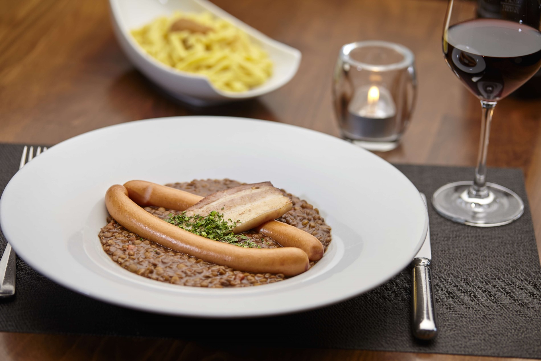 © SMG, Jean-Claude WinklerLINSEN & SPÄTZLE Linsen und Spätzle – das Traditionsgericht der schwäbischen Küche. Mit Saitenwürsten ein absoluter Klassiker, und ohne ein proteinreiches vegetarisches Gericht (wenn man den Speck weglässt und Gemüse- statt Fleischbrühe nimmt natürlich). Klein und Groß lieben diese Kombination, für viele ist es eine Erinnerung an die Kindheit. Nicht vergessen: Essig und Senf zum Abschmecken am Tisch bereitstellen! [fusion_accordion type=““ inactive_icon=““ active_icon=““ margin_top=““ margin_bottom=““ hide_on_mobile=“small-visibility,medium-visibility,large-visibility“ class=““ id=““ boxed_mode=““ border_size=“0″ border_color=““ hue=““ saturation=““ lightness=““ alpha=““ hover_color=““ background_color=““ divider_line=““ divider_hover_color=““ divider_color=““ padding_top=““ padding_right=““ padding_bottom=““ padding_left=““ title_tag=“h4″ fusion_font_family_title_font=““ fusion_font_variant_title_font=““ title_font_size=““ title_line_height=““ title_letter_spacing=““ title_text_transform=““ title_color=“#737373″ icon_size=““ icon_color=““ icon_boxed_mode=““ icon_box_color=““ icon_alignment=““ fusion_font_family_content_font=““ fusion_font_variant_content_font=““ content_font_size=““ content_line_height=““ content_letter_spacing=““ content_text_transform=““ content_color=“#212121″ toggle_hover_accent_color=““ toggle_active_accent_color=““ parent_dynamic_content=““][fusion_toggle title=“Hier klicken fürs Linsen mit Spätzle-Rezept“ open=“no“ awb-switch-editor-focus=““ class=““ id=““ fusion_font_family_title_font=““ fusion_font_variant_title_font=““ title_font_size=““ title_line_height=““ title_letter_spacing=““ title_text_transform=““ title_color=“#737373″ hue=““ saturation=““ lightness=““ alpha=““ fusion_font_family_content_font=““ fusion_font_variant_content_font=““ content_font_size=““ content_line_height=““ content_letter_spacing=““ content_text_transform=““ content_color=“#212121″] Rezept für Linsen und Spätzle Zutaten für 4 Portionen: 250 g Tellerlinsen 80 g Speckwürfel 400 ml Fleischbrühe 60 ml Rotweinessig 50 g Mehl 2 EL Tomatenmark 1 l Trollinger 1 Zwiebel Die Linsen über Nacht in kaltem Wasser einweichen. Am nächsten Tag die Zwiebel fein würfeln und in Öl zusammen mit den Speckwürfeln glasig schwitzen. Die abgeschütteten Linsen und Tomatenmark dazugeben, sowie das Mehl. Die Mehlschwitze mit dem Rotwein ablöschen und mit Fleischbrühe aufgießen. Die Linsen etwa 30 Minuten weich garen. Mit Essig, Salz, Pfeffer, Muskat abschmecken. Mit Petersilie bestreuen, und mit in Butter geschwenkten Spätzle und 1 Paar Saitenwürste servieren. [/fusion_toggle][/fusion_accordion]