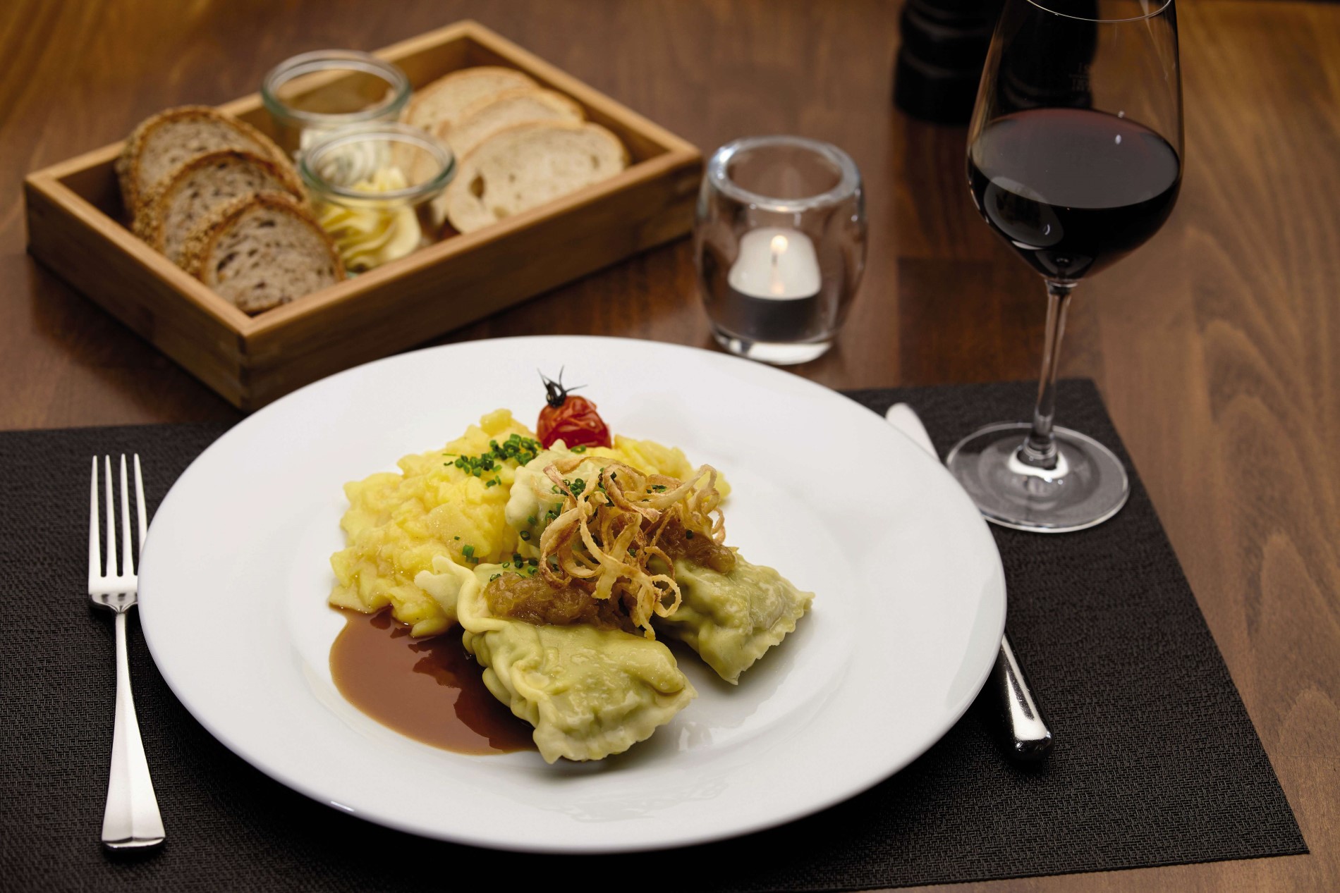 © SMG, Jean-Claude WinklerMAULTASCHEN Ob mit Zwiebeln geschmelzt, in Brühe gekocht oder mit Ei geröstet – die schwäbische Spezialität ist so lecker, dass sie heute in vielerlei Kombinationen auf dem Speiseplan steht. Der Klassiker besteht unter anderem aus Spinat, Tatar, Zwiebeln und Kräutern, aber auch vegetarische Varianten oder Leckereien wie Lachsmaultaschen sind beliebt. Der Legende nach wollte einst ein findiger Zisterzienser-Mönch im Kloster Maulbronn trotz Fastenzeit nicht auf Fleischgenus verzichten… Er mischte kurzerhand das verbotene Fleisch unter eine Spinat-Gemüse-Masse und verpackte diese in Nudelteig. So sollte das Fleisch vor dem Herrgott versteckt werden: Daher stammt auch der Spitzname „Herrgottsbescheißerle“. Die Maulbronner Nudeltaschen kamen gut an und wurden von den Hausfrauen im Lande in verschiedensten Variationen nachgekocht: Aus „Maulbronner Nudeltasche“ wurde die „Maultasche“, die traditionell am Gründonnerstag gegessen wurde. [fusion_accordion type=““ inactive_icon=““ active_icon=““ margin_top=““ margin_bottom=““ hide_on_mobile=“small-visibility,medium-visibility,large-visibility“ class=““ id=““ boxed_mode=““ border_size=“0″ border_color=““ hue=““ saturation=““ lightness=““ alpha=““ hover_color=““ background_color=““ divider_line=““ divider_hover_color=““ divider_color=““ padding_top=““ padding_right=““ padding_bottom=““ padding_left=““ title_tag=“h4″ fusion_font_family_title_font=““ fusion_font_variant_title_font=““ title_font_size=““ title_line_height=““ title_letter_spacing=““ title_text_transform=““ title_color=“#737373″ icon_size=““ icon_color=““ icon_boxed_mode=““ icon_box_color=““ icon_alignment=““ fusion_font_family_content_font=““ fusion_font_variant_content_font=““ content_font_size=““ content_line_height=““ content_letter_spacing=““ content_text_transform=““ content_color=“#212121″ toggle_hover_accent_color=““ toggle_active_accent_color=““ parent_dynamic_content=““][fusion_toggle title=“Hier klicken für das Maultaschen-Rezept“ open=“no“ awb-switch-editor-focus=““ class=““ id=““ fusion_font_family_title_font=““ fusion_font_variant_title_font=““ title_font_size=““ title_line_height=““ title_letter_spacing=““ title_text_transform=““ title_color=“#737373″ hue=““ saturation=““ lightness=““ alpha=““ fusion_font_family_content_font=““ fusion_font_variant_content_font=““ content_font_size=““ content_line_height=““ content_letter_spacing=““ content_text_transform=““ content_color=“#212121″] Rezept für schwäbische Maultaschen Zutaten Für den Nudelteig: 150 g Mehl 150 g Dunst (Mahlprodukt aus Getreide) 3 Eier 2 EL pflanzliches Öl Außerdem: 170 g Schweinehack 160 g Rinderhack 170 g Bauchspeck 50 g Schinkenwurst, geraucht 100 g Weißbrot 190 g Zwiebel 180 g Spinat 180 g Petersilie 20 g Lauch 30 g Vollei 15 g Salz Gewürzmischung Linde (Geheimzutat) Zubereitung Zutaten für den Nudelteig durch kräftiges Kneten zu einem glatten Teig verarbeiten, in Klarsichtfolie schlagen und mindestens 1/2 h im Kühlschrank ruhen lassen (wenn möglich vakuumieren, dies entspannt den Teig schneller) Zwiebel schälen, schneiden und andünsten. Petersilie, Spinat, Lauch putzen und waschen. Weißbrot einweichen. Fleisch, Spinat, Schinkenwurst, Weißbrot, Zwiebeln, Petersilie und den Lauch durch den Fleischwolf lassen. Gewürze untermengen und Vollei zugeben. Kräftig vermengen. Evtl. nachschmecken. Nudelteig dünn ausrollen. Mit etwas Ei bepinseln. Die Füllung in einen Dressierbeutel füllen und nach Belieben dick auf den Nudelteig dressieren. Den Teig maultaschenartig einschlagen, mit Hilfe eines Kochlöffels die Größe abdrücken, schneiden und in sprudelndem Wasser kochen. Rezept: Gasthaus zur Linde [/fusion_toggle][/fusion_accordion]