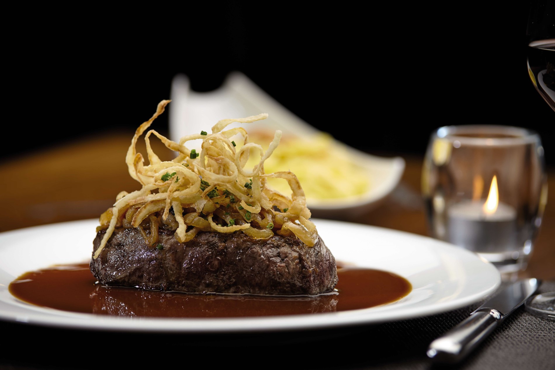 Zart-mürbes Fleisch, geröstete Zwiebeln, eine delikate Soße: Ein guter Zwiebelrostbraten ist unwiderstehlich! In so gut wie jeder Weinstube steht der Zwiebelrostbraten auf der Karte und ist ein Dauerbrenner. Dazu gibt meist es Bratkartoffeln, Spätzle oder Brot. Ein echter Klassiker! [fusion_accordion type=““ inactive_icon=““ active_icon=““ margin_top=““ margin_bottom=““ hide_on_mobile=“small-visibility,medium-visibility,large-visibility“ class=““ id=““ boxed_mode=““ border_size=“0″ border_color=““ hue=““ saturation=““ lightness=““ alpha=““ hover_color=““ background_color=““ divider_line=““ divider_hover_color=““ divider_color=““ padding_top=““ padding_right=““ padding_bottom=““ padding_left=““ title_tag=“h4″ fusion_font_family_title_font=““ fusion_font_variant_title_font=““ title_font_size=““ title_line_height=““ title_letter_spacing=““ title_text_transform=““ title_color=“#737373″ icon_size=““ icon_color=““ icon_boxed_mode=““ icon_box_color=““ icon_alignment=““ fusion_font_family_content_font=““ fusion_font_variant_content_font=““ content_font_size=““ content_line_height=““ content_letter_spacing=““ content_text_transform=““ content_color=“#212121″ toggle_hover_accent_color=““ toggle_active_accent_color=““ parent_dynamic_content=““][fusion_toggle title=“Hier klicken fürs Zwiebelrostbraten-Rezept“ open=“no“ awb-switch-editor-focus=““ class=““ id=““ fusion_font_family_title_font=““ fusion_font_variant_title_font=““ title_font_size=““ title_line_height=““ title_letter_spacing=““ title_text_transform=““ title_color=“#737373″ hue=““ saturation=““ lightness=““ alpha=““ fusion_font_family_content_font=““ fusion_font_variant_content_font=““ content_font_size=““ content_line_height=““ content_letter_spacing=““ content_text_transform=““ content_color=“#212121″] Rezept für 4 Portionen: 1 kg Roastbeef z.B. vom Staufenrind 500 ml Jus Das Fleisch von sämtlichen Fett und Sehnen befreien. In die gewünschte Portionsgröße schneiden (ca. 230 g). Rostbraten würzen und scharf anbraten, danach im Ofen bei 130 °C ca. 10 min. rosa garen. Jus: 800 g gesägte Soßenknochen 200 g Karotte 200 g Knollensellerie 250 g Zwiebeln 80 g Lauch 1 EL Tomatenmark 1 l kräftiger Rotwein Gewürze (Pfeffer, Piment, Wacholder, Nelke, Lorbeer) Kräuter ( Petersilienstiele, Thymian, Rosmarin) Für die Soße zunächst die Karotten, Zwiebeln und die Knollensellerie sehr gut waschen, wenn gewünscht schälen, aber kein Muss und in walnussgroße Stücke schneiden. Den Lauch separat waschen und kleinschneiden. Die Soßenknochen in einem Bräter oder auch größeren Topf in neutralem Öl mit Farbe anrösten. Wenn die Knochen Farbe genommen haben, das Gemüse außer den Lauch zugeben und für kurze Zeit mitrösten. Zum Schluss den Lauch noch zugeben, 1 EL Tomatenmark und mit anrösten. Mit 1/3 Rotwein ablöschen, diesen komplett verkochen lassen bis der Ansatz wieder anfängt zurösten, danach ein weiteres Mal mit 1/3 Rotwein ablöschen. Diesen Vorgang nochmals wiederholen. Das verleiht der Soße einen kräftigen Geschmack, eine dunkle Farbe und einen schönen Glanz. Wenn vorhanden mit Rinder- oder Kalbsfond aufgießen bis die Knochen bedeckt sind, ansonsten mit Wasser auffüllen.Gewürze zugeben und für etwa 5 – 6 Stunden köcheln lassen. Ggf. etwas Wasser nachgießen. Nach der Kochzeit die Soße durch einen Sieb, noch besser ist die Verwendung eines Passiertuches um alle Partikel zu filtern. Die aufgefangene Soße nochmals aufkochen und mit Salz abschmecken und etwas reduzieren lassen bis der gewünschte Geschmack erreicht ist. Sollte die Soße zu dünn sein, kann sie mit Speisestärke abgebunden werden. Die Zwiebeln machen den schwäbischen Rostbraten komplett – besonders lecker mit gleich zwei Varianten: Rostbratenzwiebel: 2 Stück Haushaltszwiebeln Butterschmalz Zwiebeln schälen und in dünne Scheiben schneiden. In zerlassener Butter goldgelb glasig schwitzen und nach Geschmack würzen. Frittierte Zwiebelringe: 2 Stück Haushaltszwiebeln Mehl, 405er Frittier-Pflanzenöl, ungehärtet Zwiebeln schälen und mit Hilfe eines Spiralschneiders schneiden. In Mehl wenden und bei 160 °C goldgelb frittieren. Auf einem Küchenpapier abtropfen lassen. [/fusion_toggle][/fusion_accordion]