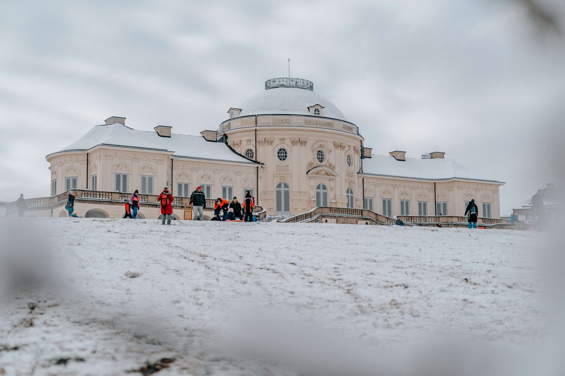 Die große Wiese hinter dem Schloss Solitude eignet sich im Winter perfekt für eine Schlittenfahrt für jedes Alter. Weiter oben können die Kleinen und Schlitten-Frischlinge auf der breiten Wiese fahren. Dort geht es nicht so weit runter und es ist auch nicht so steil. Unterhalb der Straße wird die Fläche deutlich schmaler und steiler. Die Profis unter euch können bis ganz runter in den Wald hineinfahren. In jedem Fall kommt ihr hier voll auf eure Kosten. Der fantastische Ausblick bis Ludwigsburg kann bei den Abfahrten genossen werden und beim Hochlaufen habt ihr einen tollen Blick auf das Schloss. Die perfekte Location für einen schönen Winterausflug!
