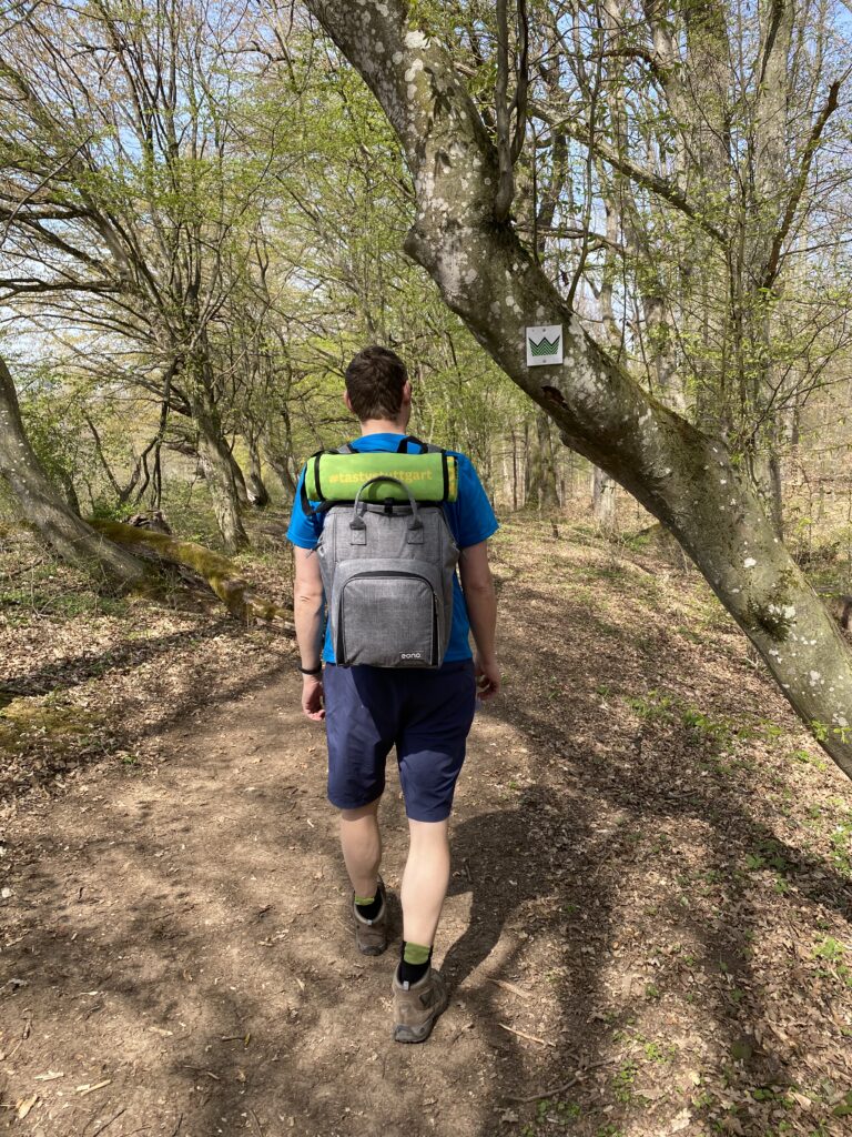 © Stadt WaldenbuchZurück im Städtle, wie die Innenstadt liebevoll genannt wird, laufen wir direkt zum Landgasthof Rössle. Hier haben wir am Vortag bereits einen Picknick-Rucksack bestellt, den wir jetzt abholen. Schwierig wird es nur bei der Frage, ob wir Rot- oder Weißwein möchten. Wir entscheiden uns für einen Riesling. Gut verpackt und mit einer Picknickdecke ausgestattet laufen wir zunächst etwa 25 min. Richtung Waldjugendzeltplatz Jungviehweide. Dort starten wir unsere Wanderung auf dem Premiumwanderweg Herzog-Jäger-Pfad.