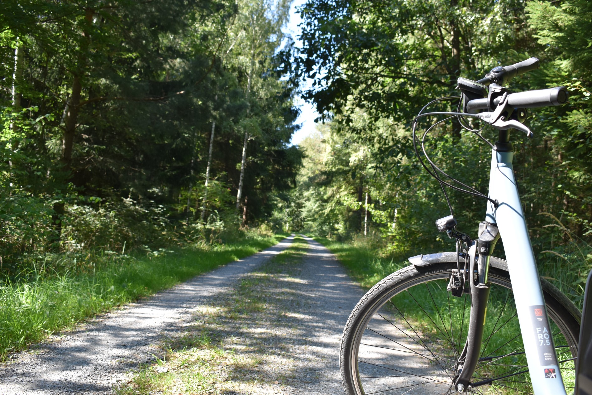 Der Weg führt uns weiter über gut ausgebaute Feldwege, vorbei an Bänken und Bäumen, sogar eine Schafsweide findet sich dort. Wir nehmen uns etwas Zeit und setzen uns für eine kurze Pause auf eine der Bänke am Wegesrand. Wir lassen den Blick durch die sanft hügelige Landschaft schweifen und die Seele baumeln, bevor wir uns zurück auf die Räder schwingen.