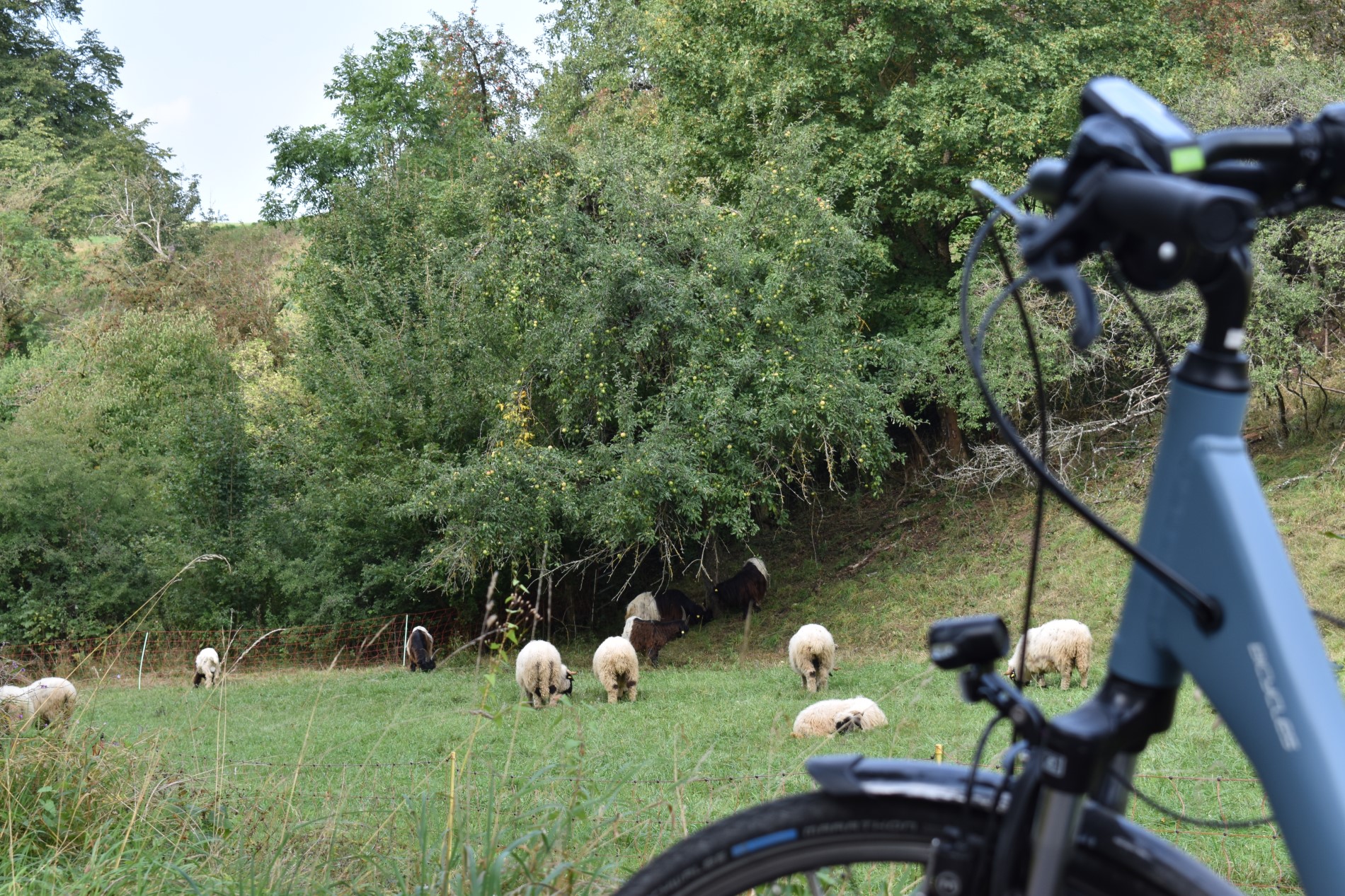 Der Weg führt uns weiter über gut ausgebaute Feldwege, vorbei an Bänken und Bäumen, sogar eine Schafsweide findet sich dort. Wir nehmen uns etwas Zeit und setzen uns für eine kurze Pause auf eine der Bänke am Wegesrand. Wir lassen den Blick durch die sanft hügelige Landschaft schweifen und die Seele baumeln, bevor wir uns zurück auf die Räder schwingen.